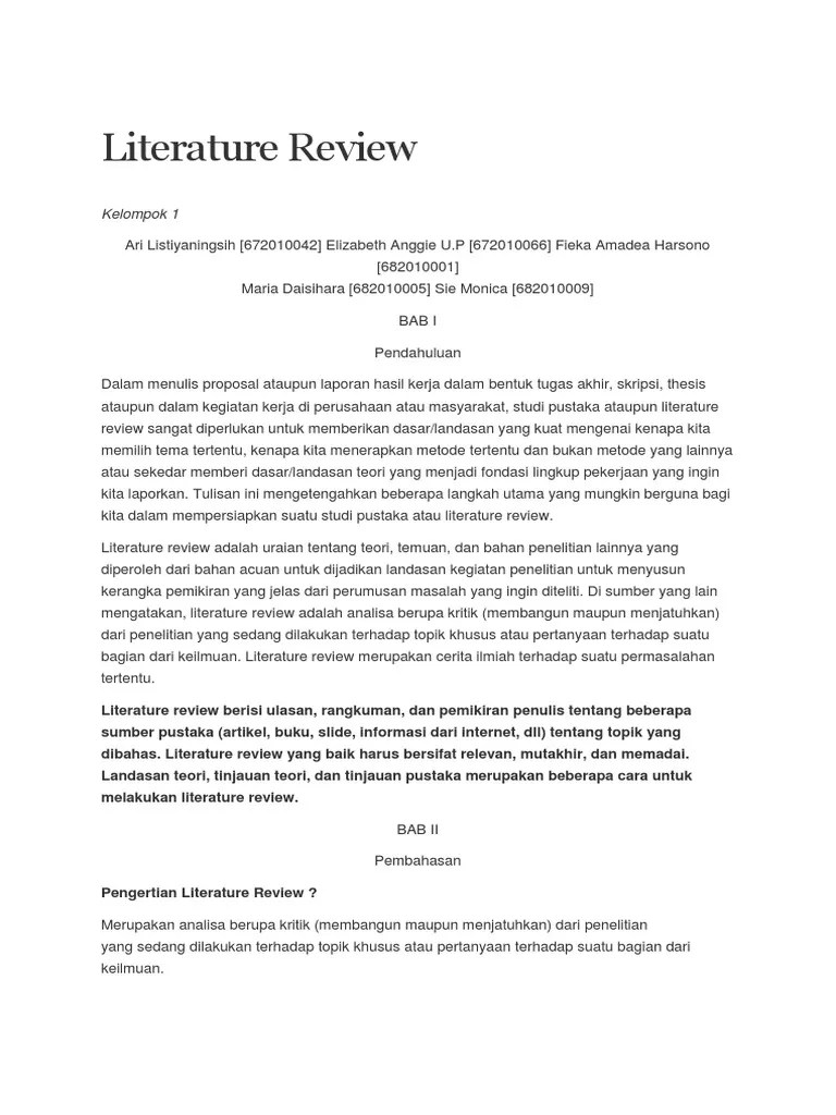 Literature review kajian pustaka merupakan salah satu elemen kunci dalam penulisan proposal dan laporan penelitian akademik. Untuk cara ni tengok tajuk kita. Jangan memetik apa-apa yang belum anda baca atau tidak faham.